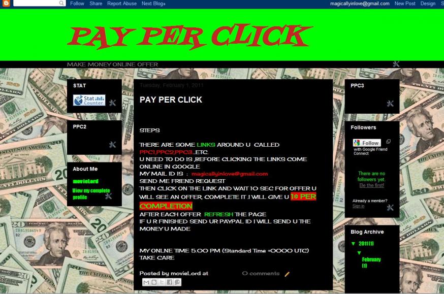 PAY PER CLICK HAI GUYS THIS IS A MONEY MAKING BLOG STEPS THERE ARE SOME LINKS AROUND U CALLED PPC1,PPC2,PPC3...ETC. U NEED TO DO IS ,BEFORE CLICKING THE LINKS COME ONLINE IN GOOGLE MY MAIL ID IS : SEND ME FRIEND REQUEST THEN CLICK ON THE LINK AND WAIT 10 SEC FOR OFFER U WILL SEE AN OFFER, COMPLETE IT .I WILL GIVE U 1$ PER COMPLETION AFTER EACH OFFER REFRESH THE PAGE IF U R FINISHED SEND UR PAYPAL ID I WILL SEND U THE MONEY U MADE MY ONLNE TIME 5.00 PM (Standard Time +0000 UTC) TAKE CARE