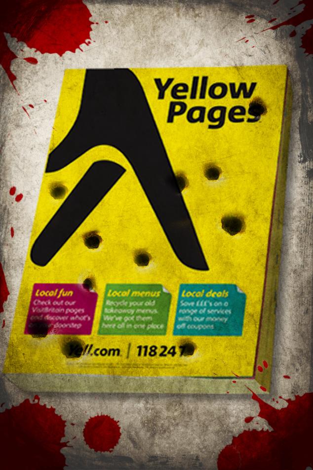 I like it but it doesn't communicate "Yellow Pages Are Dead" to me, are you able to utilize a acutal phone book with the bullet holes in it? Possibly have a couple going through the lettering. But overall it's a good start.