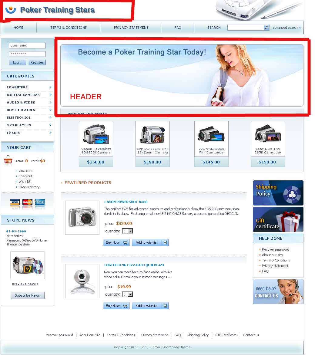 @Aderain - Love the background image you made up. Use that again but I decided to go a bit different direction with the lower header. Sorry for the change in focus. This spot will be used to make customers buy the videos that the poker training stars make. This spot will be a sales banner for making customers by the videos. So we want things like start viewing free videos today, have a look around the store. Browse Videos Now! Use your creativity to get people to buy videos.