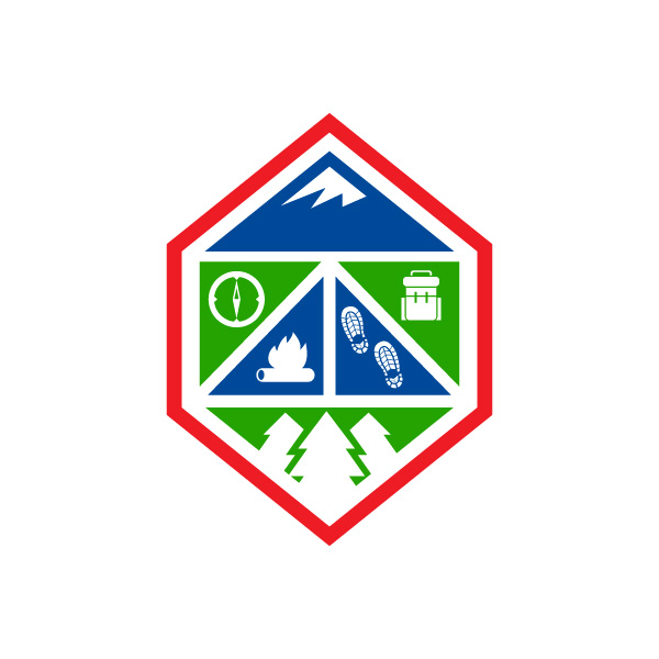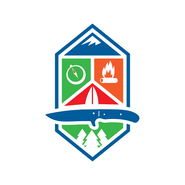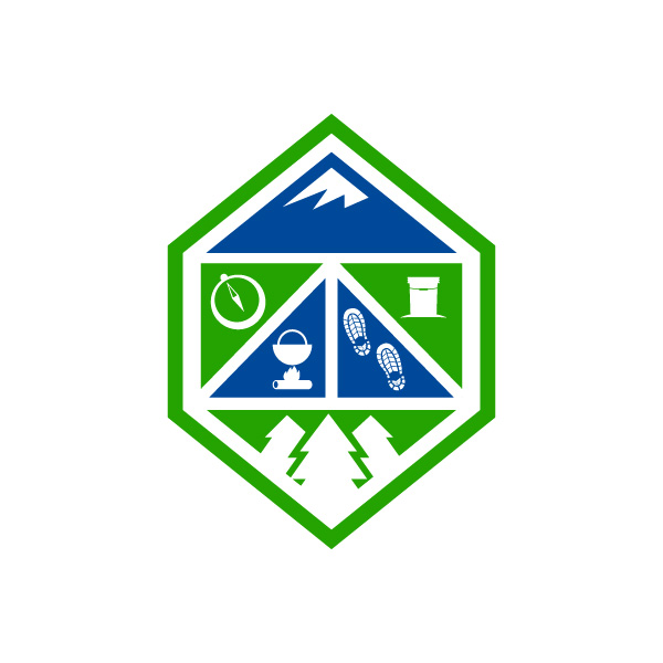 Def on the right track. Id like it to be more squareish overall instead of elongated like it currently is. Perhaps removing the knife section would shorten the height and make it more square, although I probably wouldnt want the tent icon in the final logo. I love the blue mountain at the top and the green trees at the bottom. I like a compass icon, not necessarily the one you used though. Thinking perhaps some footsteps icon to help signify a journey ( walking) and then maybe a 5 gal bucket icon or food icon of sorts if there is such a thing