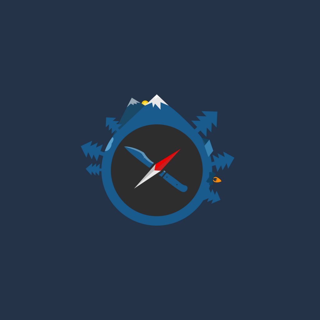 I like the symbol in the middle ( compass needle/knife ) but not crazy about the round shape and the trees popping out all over. Im more looking for a more angular outline shape like the entry above. Like keep their mountain and tree part but put your symbl in the middle
