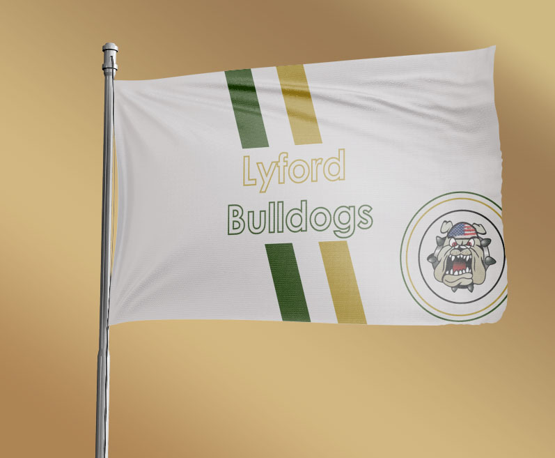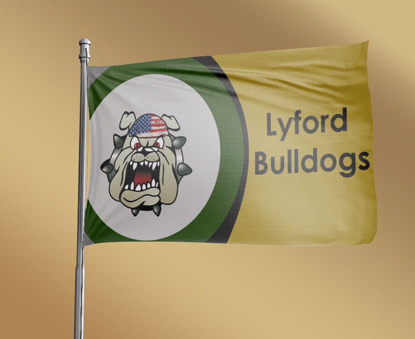 I am looking for a n eye catching flag design for my kids school. We'll be using the design to sell flags to parents and students so it needs to really pop! The School is the Lyford Bulldogs. If you want to see the school logos you can visit here https://www.lyfordcisd.net/apps/pages/index.jsp?uREC_ID=2955539&type=d&pREC_ID=2339646 I would rather have a great looking flag then try to match the school logos but the school colors do need to be used. Green, Gold, Silver, and black Lets see what you can come up with!
