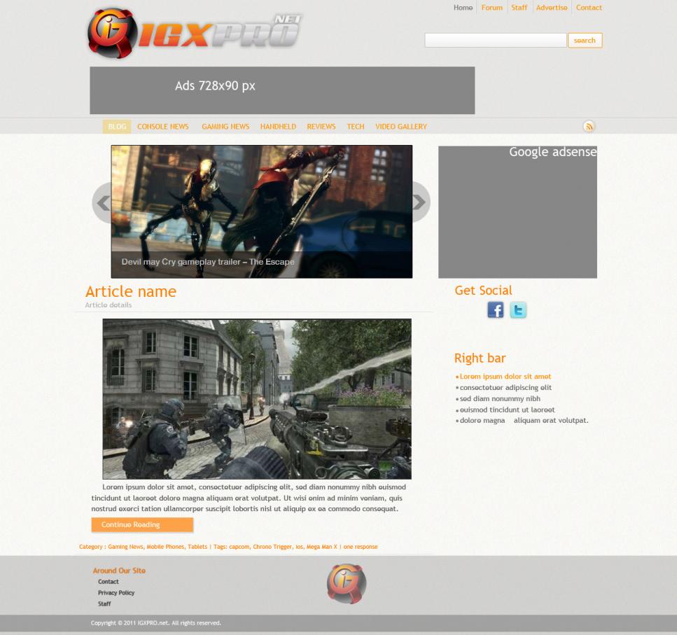 Hello, I was recently told by Google News that my site appears "warez-ish" how that's possible for a news site I'm not sure.. So I guess instead of unique design I need just a white news site.. I've seen all the free ones so please don't try and submit that. My site - http://bit.ly/lapFCY The theme must accommodation to: - on post page.. 610x300 image - 300x250, 728x90 ad sizes Sites to use as reference: engadget.com joystiq.com gameinformer.com (not as busy though) 1up.com Preferred colors: - White / Orange / accents of red and/or blue.. but use what looks good. *Please specify whether you can code the design or not for the price listed along with your submission. Questions, comments, anything.. post below or PM me. Payment will be made through Paypal after winner is chosen.