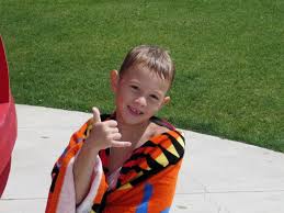 This hand genture is a shaka. Kids like this that you can't tell if it's a boy or girl. More tanned than this though please. Palm trees in the back ground. Sunshine optional.