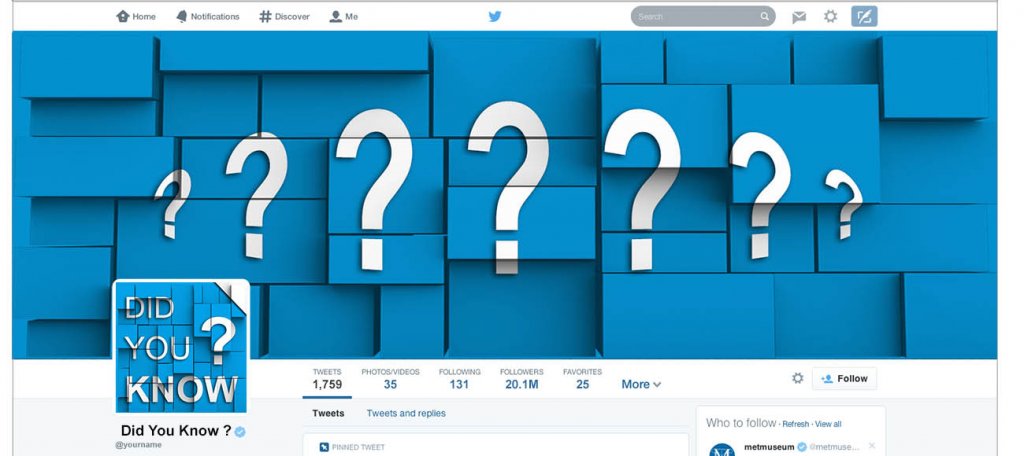 Hi Guys, Need Twitter Header Photo Image and Twitter Profile Photo designs .... Profile Photo needs to say "Did You Know?" ... and header photo should be some kind of design related to did you know, things to know, etc.... Thanks!