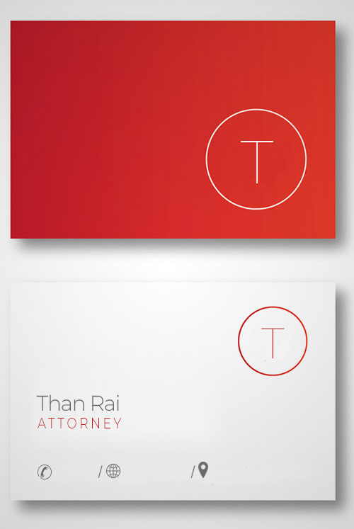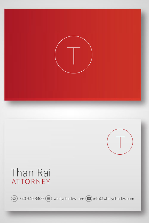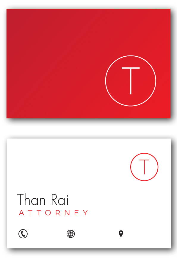 Need someone to recreate the business card from the image in the link. I want to the following edits on it. 1. Replace W logo with T 2. Replace Whitly Charles with Than Rai 3.Replace Graphic Designer with Attorney 4. Need icons for: 4.1 telephone 4.2. Email 4.3 location These will replace the "340. 340. 3000/...." Text https://imgur.com/a/vIr71
