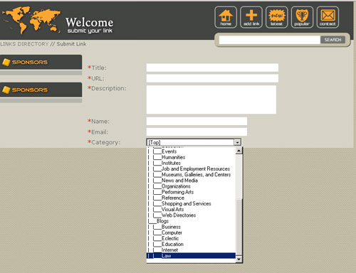 thanks for the great opportunity, however I find it a bit confusing to submit, because after selecting top and sub category I press ADD LINK and got submission form without selected subcategory, i.e. TOP is by default, and the drop down list of the subcategories are not complete - it ends by Blogs-Law. And also there is no Submit button under the form. I tried in in IE6 and Firefox - both show the same error.