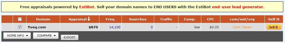 Selling 4 letter Yveq.com Estibot appraisal $870