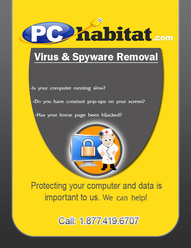 $45 dollar flyer contest - 3 days Hello fellow Digital Point members! I thought I would post a contest for my business. I'm looking for a flyer to be designed so that I can have them mailed out to my local area. My business is: PC Habitat Paper size - standard 8.5" X 11" Full Color Colors similar to my website Quality - 300dpi What I am advertising for: Virus & Spyware Removal Wording can include: Is your computer running slow? Do you have constant pop-ups on your screen? Has your home page been hijacked? Protecting your computer and data is important to us. We can help! Call: 1.877.419.6707 *note* the wording doesn't necessarily need to be exactly as above. please make posts and I will reply and ask for revisions if needed. As my grumpa would say: "GO CRAZY & BE CREATIVE" Thank you. Lhlalyam
