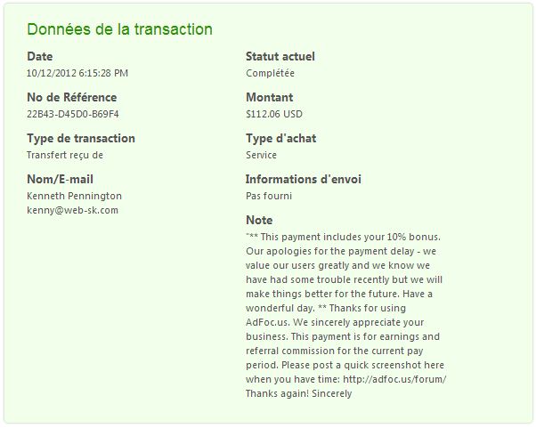 Hello Everyone Today I will introduce a very nice site, one from the best URL Shortener sites on the world ( for me he is the best ) Adfoc, Pay Us Up to 6,4$ / 1000 visits, and the advantage of this site is that he pay you just when user see the page ( not only when click SKIP like other sites ). Also if you have a site with a good traffic you can add an AUTO OVERLAY SCRIPT for your pages, you can find it in "Tools". and This is my personal payment proof for octobre, I Make 112$ just in 8 days with my page on facebook you can also get 20% from your referrals, so my offer is to make an account trought my ref Link and I will give you 50% of this comission Like this You will het 110% of your earns ( just send me a PM with Your account ID and I will send you your money each month ) Payment methods are Payza & Paypal. This is my ref Link : http://adfoc.us/?refid=68486 ( You will Get a 10% bounus if you register under me ) Thanx for reading, and Good Bye