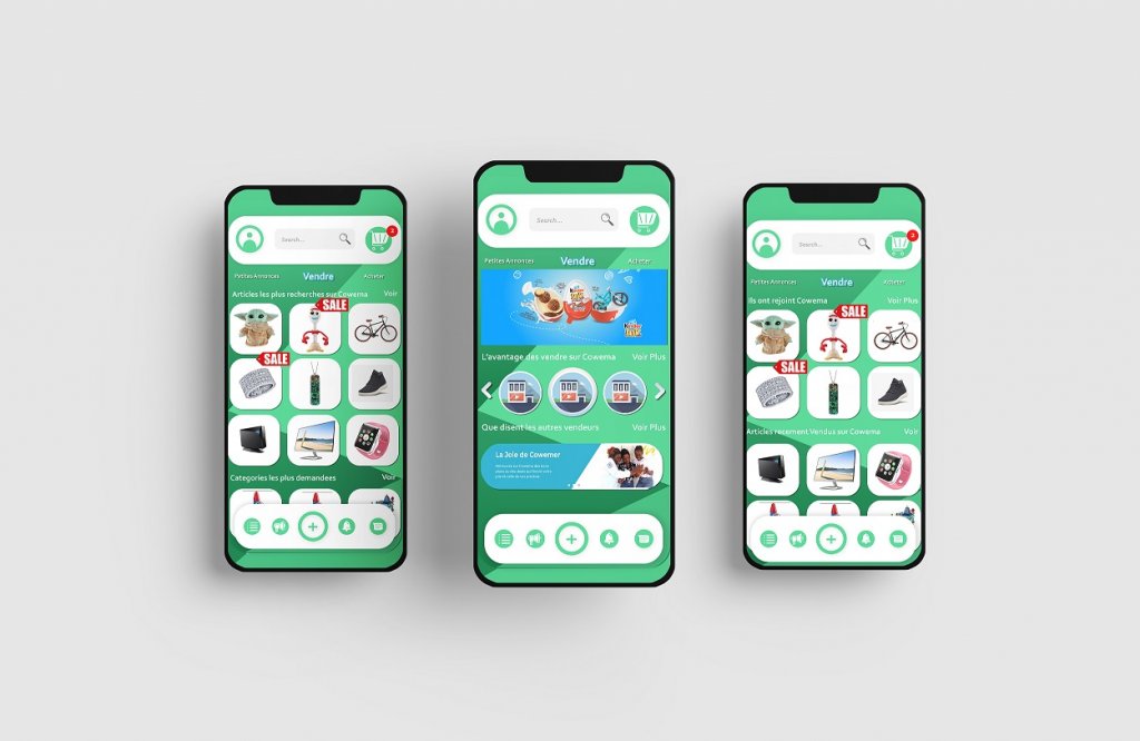 Hello Guys I want to change the home of my App called Cowema Annonce. This App is a plateform where people come to buy and sell used and new stuffs (cloth, choes, computers, houses, etc.). I need a nice design, clean and unique. Our Current home page looks like this https://i.imgur.com/yBmkHkw.png Here is the mockup of the new home page https://i.imgur.com/cpz1AbF.png. As you see, the new home page is like a 3 in 1 style: Petite Annonce (classify Ads), Vendre (SELL), Acheter (BUY)... each show different containt but the look and feel is the same. Here is the logo of the comapny https://i.imgur.com/EJ1qq9d.jpg Instructions: We want the new home page to look different Search bar has to look clean and attrack users to search for items Color: no more than three colors, use logo green color as primary color Size: normal smartphone screen size Please post in the threads, no PM. The Winner of this Contest will design 2 additional pages for an extra $100 Good luck