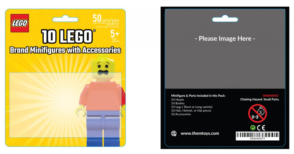 Few issues: 1) Can't use the LEGO logo, just words. 2) The front needs this other text: Title: 10 LEGO(r) Brand Minifigures with Accessories 50 pieces need to be written somewhere, like where it says 31 pcs: https://images-na.ssl-images-amazon.com/images/I/614pa9XQS1L._SL1001_.jpg INCLUDES: 10 Heads 10 Bodies 10 Legs (Short or Long) 10 Hair, Helmets, and/or Hats 10 Accessories 3) That LEGO image, I can't have any images taken from online, they'd have to be drawn images as this is going to be commercial use. Thanks!