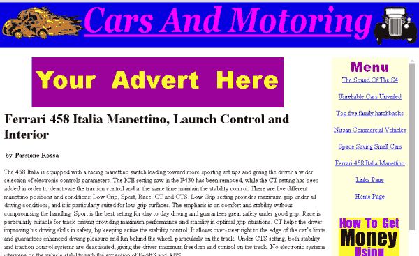 You want to make money. You either have a product to sell, or have adverts on your site to make you money, or have sponsors who will pay you if they make sales via your site. And you have a great website. However what you need is: More visitors to your website or blog. Even if it is a Twitter or Facebook page, you need more site visitors and more followers/likes. So people have to know about your site (or blog or Facebook page, or Twitter feed). And that is where I come in. I can supply REAL spots to bring REAL visitors to your website. This is for a permanent advert on one page of cars-and-motoring.com. The advert will be at the top of the page. Below you will see an example of how your advert will look. This advert is currently 75% Off. This website is (as the name suggests) aimed at people with cars. Or, in other words, most of the adult population. Nearly everyone has a car, and they are our audience. Because of the large variety of people who use this website, it gets all kinds of visitors, so is suitable for all kinds of advertising. Whatever your product or website, you will benefit from advertising on this site. And remember, being a permanent link, Google will love this, it will count towards improving your search engine results. To see an example of what an advert looks like on site look at http://cars-and-motoring.com/0004-top5hatchbacks.shtml The advert "Are You Psychic?" at the top of the page is in the same position on that page as the advert you get when you buy this deal (although your advert will be on a brand new page). This is a new site, so at the moment the advert is 75% Off. This is a permanent advert, and will remain on the site forever. But you only have to pay once, no recurring fees!!!! Normally I charge $120 for a spot like that. But at the moment I am only charging $30. Get it now while it is still 75% Off. And remember - you usually have to pay $10 to $20 per month for a link like that, but you are getting it "forever", so within three months the advert will have paid for itself, and from then on you get free advertising "forever". At the moment I am expanding my range of websites. I am bringing out new sites fairly regularly, which means I currently have more advertising and link spots than normal. Which is why I am offering some of them at this ridiculously low price. And how long does your advert last for? Well every site I have offered this deal on is still running, and the adverts placed on them are still running too. The very first ones were placed in 2004, well over ten years ago, and they are still there. Over ten years worth of advertising their website or product, with the advert still up even now. All for one small charge! But when I do offer this deal I normally charge $120 for the advert. Recently I have been offering them on new sites at half price ($60). However now I am going to try an experiment. I'm going to half the price again. That is right, half of half price. A quarter the normal price (or 75% off, if you prefer). That is QUARTER price. Only $30 for a permanent advert for your website or product, right at the top of the page. And remember - you usually have to pay $10 to $20 per month for a link like that, but you are getting it "forever", so within one and a half to three months the advert will have paid for itself, and from then on you get free advertising forever. If you cannot afford thirty bucks to promote your website or business, then you are not really serious about it, are you? You can have either a banner advert or a text advert. However there are some rules: 1) This is a "suitable for everyone" website, so no adverts for sites selling/recommending/discussing stuff that is unsuitable including (but not limited to): pornography, gambolling, tobacco products, vaping, drugs (both legal and illegal) or banners/adverts that show representation thereof. Obviously the usual suspects (illegal sites, cruelty sites, hate sites, sites advocating racism or other bigotry, etc) may not be advertised either. If in doubt, ask me, the worst that can happen is that I say "no". 2) The banner or text of the advert must be accurately representative of the site. 3) Dead links harm a sites Google ranking so if your site or banner 404s I will remove your link. If you have a genuine problem and notify me reasonably promptly, I'll restore the link as soon as it is fixed at your end. But if it dead for a long time and you don't contact me, I'll assume you have given up the site, and it is dead, so I will eventually resell the spot. 4) I have a lot of trouble with people buying a link for an OK site, then changing either the site or the banner to something that is not OK. Or to something that would be OK if the advert and site matched, but changing one or other so that they don't match. I don't want any blind links on this site, so if you try either trick on me and you change the site or banner so that the advert is no longer representative of the site, or either no longer obeys the rules set out here, I will remove your advert and resell the spot. In such a case you will not get a refund. 5) Your advert will be on the site FOREVER, so obviously we cannot host your banner, or we would loose money on every deal. So we only display it. This means you have to supply a URL to a banner (e.g. "http://www.your-site.com/banner.jpg). If this is a problem for you (I know it is for some people) remember that you can have a text link instead. If you want a banner link, it must be at least five times as wide as high. This is because the site is 100% responsive, and the surfer's browser will make your advert as big as possible. If it is less than five times as wide as it is high, this will make it obscure the text on wide screen monitors. (N.B. it can be wider than five times the height. For example, standard banners are 468 x 60 which is nearly eight times the width as height, that would be fine). You can see an example of a banner exactly five times as wide as high 
