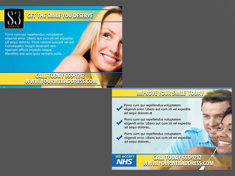 Looking for someone to design a "a6 postcard" - spec sizes below. Front and back for a dental practice. Logo attached . The S3 Dental logo is the name of the company and the NHS logo is one of the insurance firms we accept. the NHS logo can be minimal. Will be looking to add some text front and back and then a space on the right side for address label and postage stamp. Provisional designs asked for, and then will work with contest winner to finalise the design and add actual text on. Potential design is something modern, but with a picture of a woman / man or couple smiling showing teeth and a few text boxes to explain what we are advertising. $75 Paypal payment on final product. NO TEETH ICONS please. Document Trim Size Horizontal 148 x 105 mm 1748 x 1240 pixels Vertical 105 x 148 mm 1240 x 1748 pixels Full Bleed Size Horizontal 151 x 108 mm 1784 x 1276 pixels Vertical 108 x 151 mm 1276 x 1784 pixels