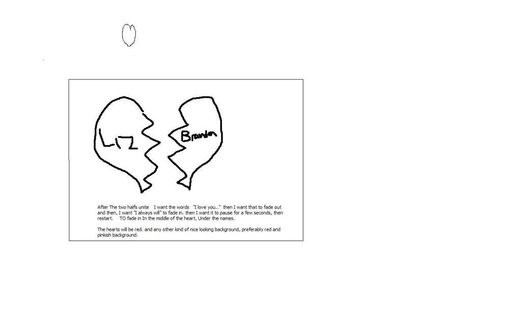 Ok well I need somthing like this done, First off I want the two hearts to first be seperated, then I want them to come together slowly. The left heart will have the name "Liz" on it. The right heart will have the name "Brandon" on it. After They unite I want the words "I love you" to fade in under the names. Then I want the words "I love you" to fade out and the words "I always will" to fade in, then I want it to pause for a few seconds, then I want the animation to restart. here is an example. I NEED THIS DONE ASAP, Contact me VIA MSN messenger! is my msn messenger. http://i48.photobucket.com/albums/f223/elkerb/examplepiz.jpg Thats the example. Anyone Please let me know if you can do this