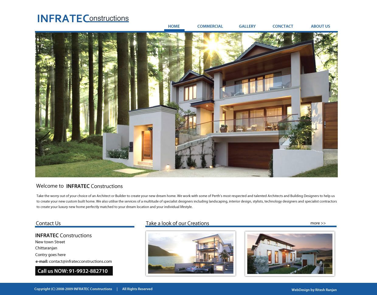Home page: introduction/ welcome, photographs (scroller), ‘Call to Action’ (call infratec), information re: design and build process (headings linking to commercial or development page or another page).