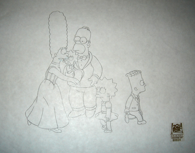 Thanks. I remember the 2nd one also - but don't know the title of the drawing. I think the actual scene is where Marge is telling the family not to do anything and they're walking on the grass as the car is too rubbish to park out the front... How much should I price these two on ebay?