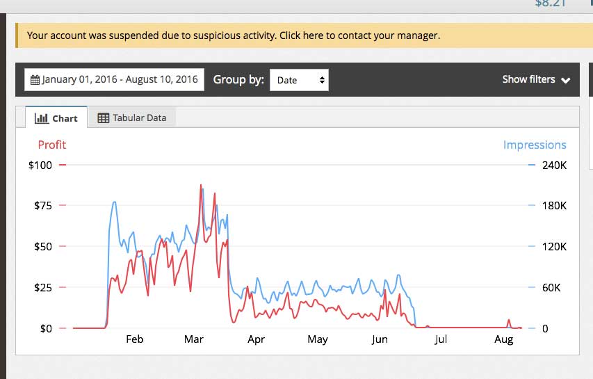 Yeah. This is my screenshot. I have been using them quite a while now. on and off. But recently I got suspended for some reason. I stopped sending them traffic from June and somehow I got suspended few days ago. Tried to contact the publisher manager "Claire" but she didn't even reply my email or Skype. My website ranked around 7000 to 10000 alexa all times and I have been keeping this account at least 2 years. This is very strange that they suspended me for no activity. I am waiting response from their ticket system. Will update you guys.