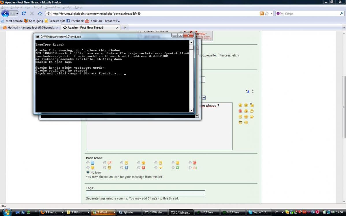 Im using Windows Vista , the error is Apache 2 is running, do not close this window. (OS 10 048) is normally permitted only one usage of each socket address (protocol / network address / port). : make_sock: Could not bind to address 0.0.0.0:80 no listening sockets available, shutting down Unable to open logs Apache Could not be started.