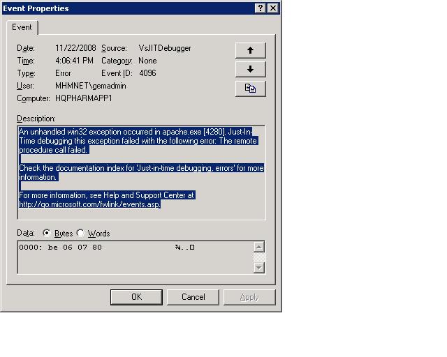 -------------------------------------------------------------------------------- My company is implementing a web database system for our finance department. The basic premise is to allow financial data to be uploaded from our users computers and stored in a server side database. The vendor who is designing this app for us is using apache inside of xampp and when we test the app it crashes during the upload process. it gives me a windows event id of 4096 and says the issue is with vsjitdebugger. unhandled win32 exception in apache.exe (4280) just in time debugging- the remote procedure call failed. I have attached a screenshot and the logs.