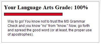 Your Language Arts Grade: 95% Way to go! You know not to trust the MS Grammar Check and you know "no" from "know." Now, go forth and spread the good word (or at least, the proper use of apostrophes).