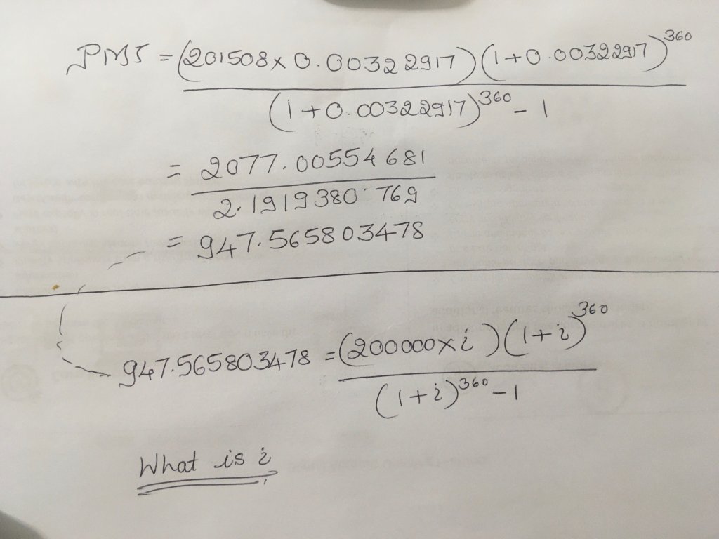 To quote the last paragraph: Sorry Raj, I myself am foreign to the nature of the APR equation and so I can't guarantee that my demo (see below) has robust solution. Instead of Newton-Raphson method suggested by your article, this demo - oh, I have difficulty explaining this - does guessing by using javascript natural random generator and tries to reduce its search range until it meets specified precision. Feel free to modify it and good luck <!DOCTYPE html> <html lang="en"> <head> <meta charset="utf-8"> <meta name="viewport" content="width=device-width, initial-scale=1.0"> <title>apr estimator</title> <style> form{ display: inline-block; } label{ display: block; margin-bottom: 0.1em; } label:after{ content: ''; display: block; clear: right; } input[type="text"]{ float: right; width: 12em; margin-left: 0.5em; } input[readonly]{ border: 0; } </style> </head> <body> <h1>apr estimator</h1> <form autocomplete="off"> <fieldset> <label>fees: <input type="text" name="fees" value="1508"></label> <label>p: <input type="text" name="p" value="200000"></label> <label>n: <input type="text" name="n" value="360"></label> <label>pv: <input type="text" name="pv" readonly></label> <label>i1: <input type="text" name="i1" value="3.625"></label> <label>i: <input type="text" name="i" readonly></label> <label>c1: <input type="text" name="c1" readonly></label> <label>c2: <input type="text" name="c2" readonly></label> <label>c3: <input type="text" name="c3" readonly></label> <label>prec: <input type="text" name="prec" value="0.00001"></label> <hr> <label>pmt: <input type="text" name="pmt" readonly></label> <hr> <label>apr: <input type="text" name="apr" readonly></label> </fieldset> <button name="submitButt" type="submit">calculate</button> </form> <script> 'use strict'; var elForm = document.getElementsByTagName('form')[0], elButt = elForm['submitButt'], p, n, pmt, apr = 0, kApr = 0.01, prec, //precision err = 999, //assume initial error of newPmt - pmt t = null; function guessApr(){ if(err < prec)//stop calculation and show result elButt.textContent = 'calculate'; else{ var newApr = apr + kApr * (2 * Math.random() - 1), newPmt = p * newApr * Math.pow(1 + newApr, n) / ((Math.pow (1 + newApr, n)) - 1), newErr = Math.abs(newPmt - pmt); if(newApr > 0 && newErr < err){//if is better then save, show and continue with new apr guess err = newErr; apr = newApr; kApr /= 2; //reduce search range console.log(kApr); elForm['apr'].value = apr;//show it } //else continue with previous apr guess t = setTimeout(guessApr, 100); } }; elForm.onsubmit = function(ev){ ev.preventDefault(); if(elButt.textContent === 'calculate'){ elButt.textContent = 'stop'; //get numbers p = Number(elForm['p'].value); n = Number(elForm['n'].value); prec = Number(elForm['prec'].value); //pmt calculation this['pv'].value = p + Number(this['fees'].value); var i2 = Number(this['i1'].value) / 100; this['i'].value = i2 / 12; this['c1'].value = Number(this['pv'].value) * Number(this['i'].value); this['c2'].value = Math.pow(1 + Number(this['i'].value), Number(this['n'].value)); this['c3'].value = Number(this['c2'].value) - 1; pmt = Number(this['c1'].value) * Number(this['c2'].value) / Number(this['c3'].value); this['pmt'].value = pmt; //apr calculation t = setTimeout(guessApr, 100); } else{ clearTimeout(t); elButt.textContent = 'calculate'; } }; </script> </body> </html> HTML:
