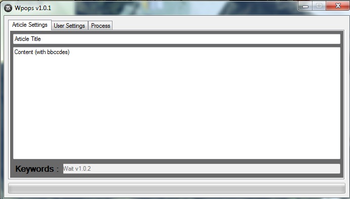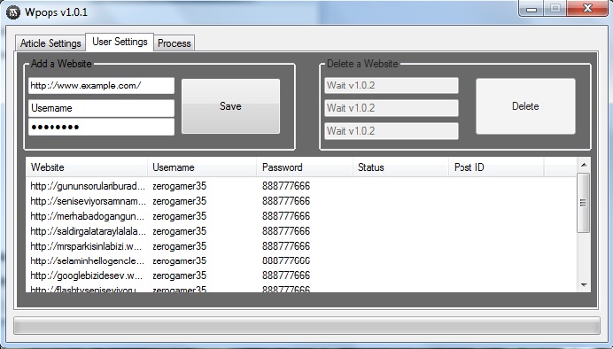New update* 1.0.1 -Added thread functions (no more stuck) -Added progressbar to following process -Added post id and status section in listview -Added new language english To setup* -IF you are using free wordpress.com services you do not have to setup anything, but if you have lots of wordpress sites like example.com, example1.com you make sure to open XMLRPC services on your blogs. You can find this option here (wp-admin> options> writing) -Set up your article in the first page ( you can use bbcodes and html codes, at this moment programme does not support keywords) -Next page add your websites; http://www.example.com/ ( your article websites) Username (Your admin username) Password (Admin's username) and click save button. -Last page just click start button. Screenshots* Download Link* - http://www.dosya.tc/server20/cowPVa/Wpopsv101.rar.html (v1.0.1) Wair for v1.0.2 and do not forget I'm not a professional c# programmer it just a hobby for me.