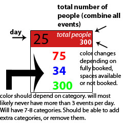 Hello DP. I need a Reservation Book script designed which will show up in Calendar view. Basically, I have a reservation book on paper that I would like to transfer over onto a website, so that I can access it from anywhere and be able to make changes/reservations. It needs to be password protected and would be great if styling could be edited either in a CSS file or through the HTML (I prefer CSS but have no problem editing either) I need the following: Category Support (color coded), Should be able to click on a date and then add another reservation or look at reservations, add number of people, price per person, date, name and phone number. The calendar should output like the picture attached (picture only shows one day but should be self explanatory). Weekends should be 20pixels wider then weekdays (weekends are friday, saturday and sunday). Should be able to search events. There is one slight error in the picture: It says there will never be more than 3 events per day. That's actually 4 categories per day, with unlimited events per day. Sample categories are: Birthdays, Weddings, Barmitzvah/Batmitzvah, Funeral, Banquet, A-la-carte. When selecting the category, there should be a checkbox which allows you to fully book the day for that event, making the day "unavailable". If you look on the mods.jpg that I attached, April 3rd, April 8th, and April 22nd, that's about what I'd like to have. Ignore the way the other dates look. Let me know how much you think this will cost. I would like to mention that I really like the Event Calendar here: http://www.phpjabbers.com/demo/eb_20/index.php?controller=Admin&action=login It just has some shortcomings. Thanks, Nick