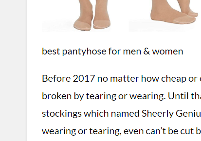What is the goal for the post? The page is constructed so poorly, the content is written so badly, and the comments are so obviously fake that it's hard to work out what is going on. I don't believe, not for a second, that you've ever asked men to try those pantyhose (your profile implies you're a woman) and give you feedback. Let's take it seriously for a second. The website is for men's compression pantyhose so the post title shouldn't even mention gender, that's covered by the branding of the site. The related posts (ads?) above the post should be related to the post, and of interest to men. Only 1 of the 3 was appropriate. If you can't ensure your ads are good then reconsider your advertising. I have a widescreen display so its not my settings causing this... the contents should be in the sidebar if you need them - hint, you don't Don't orphan your headings above ads and images Captions should be visually distinct from the body of the article Your site is here to sell, so invest in good writing and good sub-editing. This mangled text is fine on a hobby site discussing something you are both passionate about and have a unique insight into but not here. Other than learning that Sheertex exists, I've learnt nothing and haven't been inspired to buy these for my husband or son.