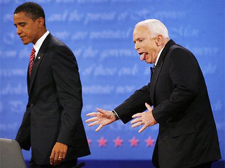 I think it's real. If you'll watch the 3rd debate, this was after the end. McCain did a kind of double take as to which direction to go to exit - hands up, eyes pop, and, what you have here. He followed Obama out and around the table. It's a weird mannerism that he has, actually. Edit: Just confirmed. 1:29:57 or so of the video.