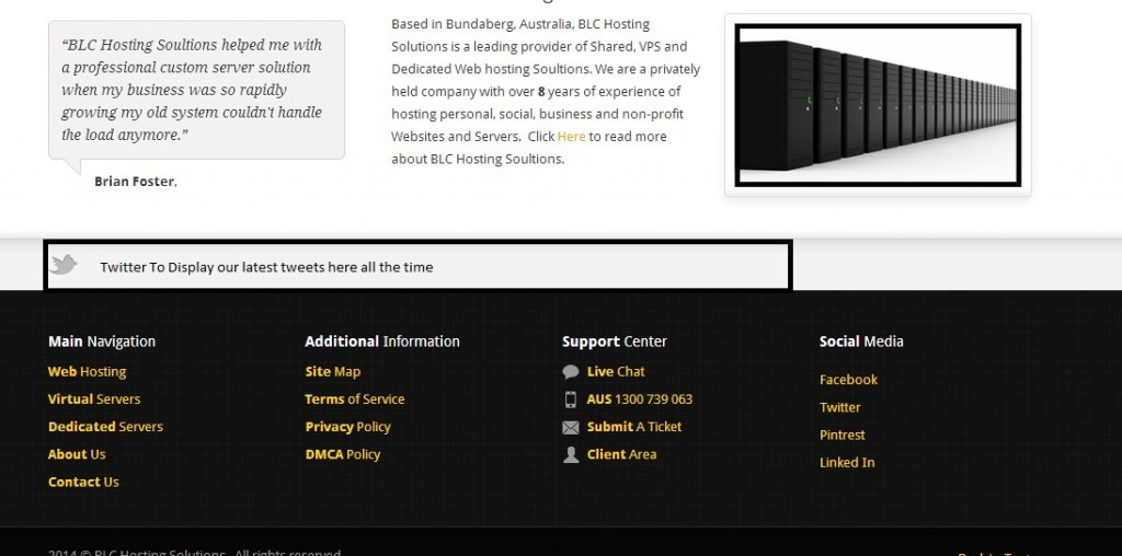 Hi, So im trying to implement twitter into the footer of a website at www.blchost.com but so far can only implament it via a twitter button. But i want it to show the latest tweet without clicking any buttons. On the page at www.blchost.com/contact.html at the bottom footer you can see a section which has the twitter icon then beside it has Retrieving latest tweet... that is where i would like the tweets to be displayed. Any Suggestions on how to acheive this?