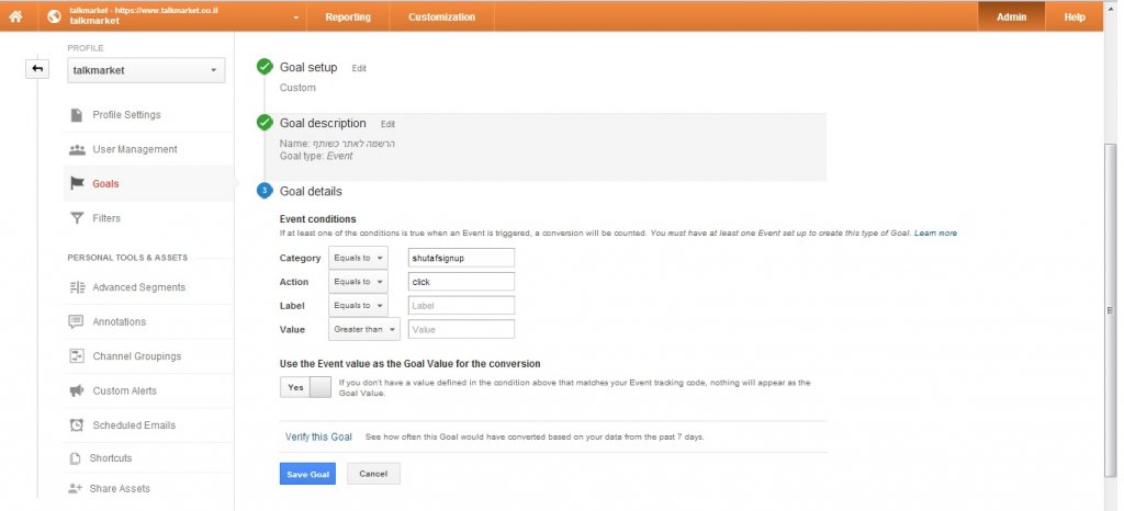 Hello, I'm trying to set a goal by event on my site. You can see one example here: <input class="button" type="submit" value="הרשמה" onclick=" _gaq.push(['_trackEvent', 'shutafsignup','click',window.location.pathname])" /> Everytime someone clicks on the button, I want google to count it. I attached an image file with the goal settings on analytics. How can I make it work? Can you recongnize any problem with my settings or the way I inserted the onclick code?