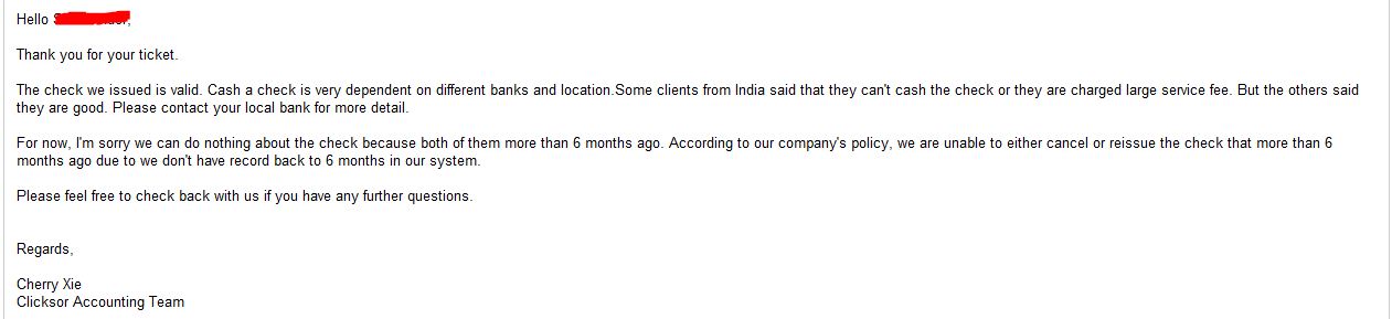 Most checks are good up til 180 days or six months. The letter you posted clearly states that you held the check past that point so they won't cash it. There is nothing wrong with Clicksor or your bank. That's standard procedure.