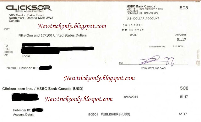 Well, it may sound funny but I got scammed by Clicksor. I received my first cheque on 2011-08-11 (1 yr old) and 2nd cheque on 2011-09-13. I went to bank and they said this process will take upto 1 month for Validation. After waiting some days I went to bank and they said Your cheque is not accepted or it got bounced. It probably happens when company is fake or Refuse to send payment. Well, That Newtricksonly.blogspot.com is mine blog and I made post "Clicksor is Legit" when I received cheque from them. But in real, it was fake cheque. Payment is 1 year old but still Scam is Scam. I thought it is scam and I let it go but Now After 1 year, I am rebuliding my blog and searched forums and many said they received payments. But why not me? I am waiting for Reply from Clicksor here and Looking forward if I get my two 50$ payments back or not. Regards, shinchan900