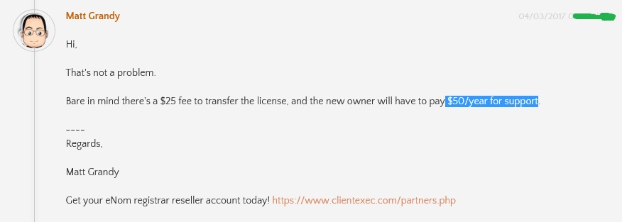 I am selling my ClientExec owned licence New client pay just $50/year for support Price for license $200 - You save 299$ If you need unbranded license you must buy it by price $99 Accepted: Paypal, Payza, WMZ