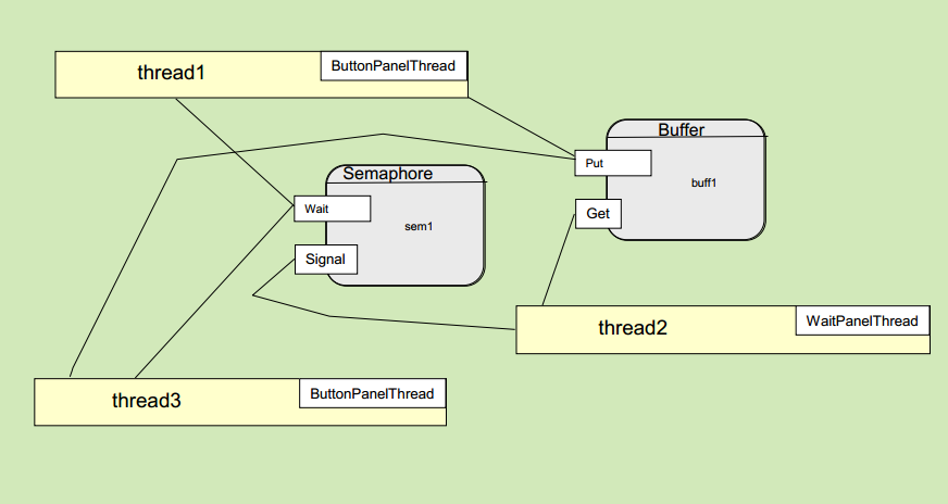 i am currently working on an example of concurrency using semaphores, and if it takes one semaphore and buffer (see UML) in this example to pass the object from buttonpanel to waitpanel. knowing this you would need another semaphore and buffer to pass from waitpanel to another waitpanel1, what i'm having problems with is how this is reflected this in the code, the relationship and initializing of the semaphore to semaphore1 and buffer to buffer1.. i understand the uml but doing this with the code is another matter.. using System; using System.Windows.Forms; using System.Threading; using System.ComponentModel; using System.Collections; using System.Data; using System.Drawing; public class Form1 : Form { private Container components = null; private ButtonPanelThread p1; private Button btn1; private WaitPanelThread p2; private WaitPanelThread1 p3; private Thread thread1, thread2, thread3; private Semaphore semaphore; private Semaphore1 semaphore1; private Buffer buffer; private Buffer1 buffer1; private Thread semThread, semThread1; private Thread buffThread, buffThread1; private Panel pnl1, pnl2, pnl3; public Form1() { InitializeComponent(); semaphore = new Semaphore(); semaphore1 = new Semaphore1(); buffer = new Buffer(); buffer1 = new Buffer1(); p1 = new ButtonPanelThread(new Point(40, 10), 120, true, pnl1, Color.Blue, semaphore, buffer, btn1); p2 = new WaitPanelThread(new Point(5, 10), 200, true, pnl2, Color.White, semaphore, buffer); p3 = new WaitPanelThread1(new Point(5, 10), 200, true, pnl3, Color.White, semaphore1, buffer1); semThread = new Thread(new ThreadStart(semaphore.Start)); semThread1 = new Thread(new ThreadStart(semaphore1.Start)); buffThread = new Thread(new ThreadStart(buffer.Start)); buffThread1 = new Thread(new ThreadStart(buffer1.Start)); thread1 = new Thread(new ThreadStart(p1.Start)); thread2 = new Thread(new ThreadStart(p2.Start)); thread3 = new Thread(new ThreadStart(p3.Start)); this.Closing += new CancelEventHandler(this.Form1_Closing); semThread.Start(); buffThread.Start(); thread1.Start(); thread2.Start(); thread3.Start(); } protected override void Dispose(bool disposing) { if (disposing) { if (components != null) components.Dispose(); } base.Dispose(disposing); } private void InitializeComponent() { this.pnl1 = new System.Windows.Forms.Panel(); this.btn1 = new System.Windows.Forms.Button(); this.pnl2 = new System.Windows.Forms.Panel(); this.pnl3 = new System.Windows.Forms.Panel(); this.pnl1.SuspendLayout(); this.SuspendLayout(); // // pnl1 // this.pnl1.BackColor = System.Drawing.Color.White; this.pnl1.Controls.Add(this.btn1); this.pnl1.Location = new System.Drawing.Point(29, 200); this.pnl1.Name = "pnl1"; this.pnl1.Size = new System.Drawing.Size(260, 30); this.pnl1.TabIndex = 0; // // btn1 // this.btn1.BackColor = System.Drawing.Color.Pink; this.btn1.Location = new System.Drawing.Point(0, 0); this.btn1.Name = "btn1"; this.btn1.Size = new System.Drawing.Size(30, 30); this.btn1.TabIndex = 0; this.btn1.UseVisualStyleBackColor = false; // // pnl2 // this.pnl2.BackColor = System.Drawing.Color.White; this.pnl2.Location = new System.Drawing.Point(295, 200); this.pnl2.Name = "pnl2"; this.pnl2.Size = new System.Drawing.Size(260, 30); this.pnl2.TabIndex = 1; // // pnl3 // this.pnl3.BackColor = System.Drawing.Color.White; this.pnl3.Location = new System.Drawing.Point(561, 200); this.pnl3.Name = "pnl3"; this.pnl3.Size = new System.Drawing.Size(260, 30); this.pnl3.TabIndex = 2; // // Form1 // this.BackColor = System.Drawing.Color.LightGray; this.ClientSize = new System.Drawing.Size(861, 462); this.Controls.Add(this.pnl1); this.Controls.Add(this.pnl2); this.Controls.Add(this.pnl3); this.Name = "Form"; this.Text = "Test"; this.Closing += new System.ComponentModel.CancelEventHandler(this.Form1_Closing); this.pnl1.ResumeLayout(false); this.ResumeLayout(false); } private void Form1_Closing(object sender, CancelEventArgs e) { // Environment is a System class. // Kill off all threads on exit. Environment.Exit(Environment.ExitCode); } }// end class form1 public class Buffer { private Color objectColor; private bool empty = true; public void Read(ref Color objectColor) { lock (this) { // Check whether the buffer is empty. if (empty) Monitor.Wait(this); empty = true; objectColor = this.objectColor; Monitor.Pulse(this); } } public void Write(Color objectColor) { lock (this) { // Check whether the buffer is full. if (!empty) Monitor.Wait(this); empty = false; this.objectColor = objectColor; Monitor.Pulse(this); } } public void Start() { } }// end class Buffer public class Semaphore { private int count = 0; public void Wait() { lock (this) { while (count == 0) Monitor.Wait(this); count = 0; } } public void Signal() { lock (this) { count = 1; Monitor.Pulse(this); } } public void Start() { } }// end class Semaphore public class Buffer1 { private Color objectColor; private bool empty = true; public void Read(ref Color objectColor) { lock (this) { // Check whether the buffer is empty. if (empty) Monitor.Wait(this); empty = true; objectColor = this.objectColor; Monitor.Pulse(this); } } public void Write(Color objectColor) { lock (this) { // Check whether the buffer is full. if (!empty) Monitor.Wait(this); empty = false; this.objectColor = objectColor; Monitor.Pulse(this); } } public void Start() { } }// end class Buffer1 public class Semaphore1 { private int count = 0; public void Wait() { lock (this) { while (count == 0) Monitor.Wait(this); count = 0; } } public void Signal() { lock (this) { count = 1; Monitor.Pulse(this); } } public void Start() { } }// end class Semaphore1 public class ButtonPanelThread { private Point origin; private int delay; private Panel panel; private bool westEast; private Color colour; private Point obj; private int xDelta; private int yDelta; private Semaphore semaphore; private Buffer buffer; private Button btn; private bool locked = true; public ButtonPanelThread(Point origin, int delay, bool westEast, Panel panel, Color colour, Semaphore semaphore, Buffer buffe