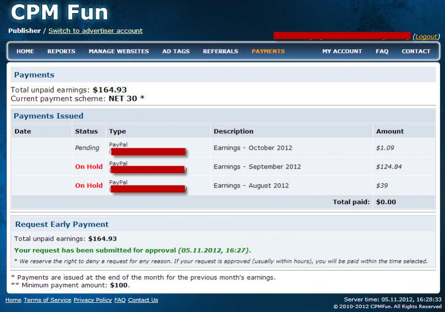 If I have not recieve for the next 3 days. I will officially announce that CPMFun is a scam. They refuse my first request early payment, and now they put it on hold without any reason and never answer my question through contact form.
