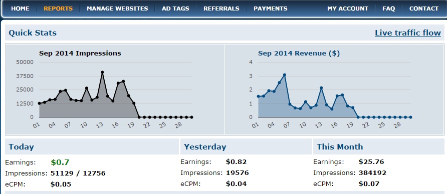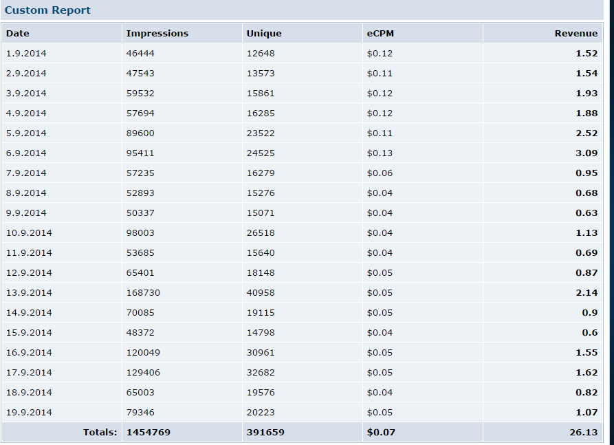 Hello I have a problem in Cpmfun with impressions and revenue after day 6 Sep became a low revenue . Note that the number of impressions is the same as it was before 6 Sep but profits became less dramatically. in the pic my REPORTS page and you can compare the revenue with impressions. You will see the difference. why the revenue is less. i don't changed any thing in my site. what is the problem ? I sent them a message on about this problem from weeks ago, but they did not respond me. Is the problem only with me ? regards