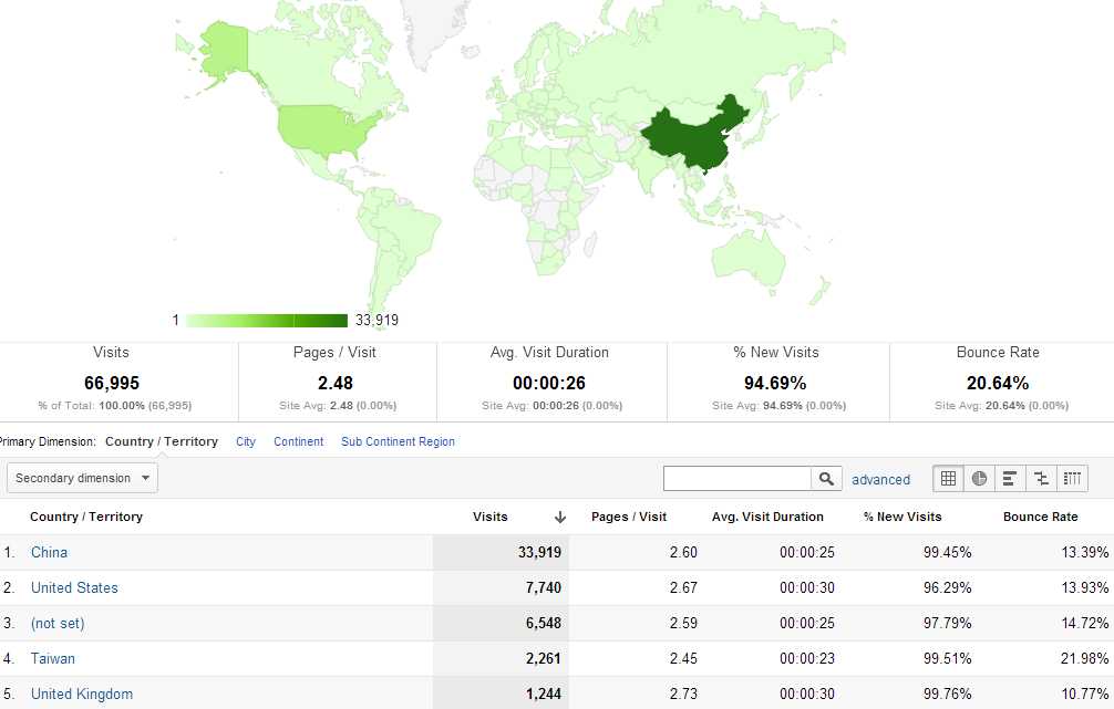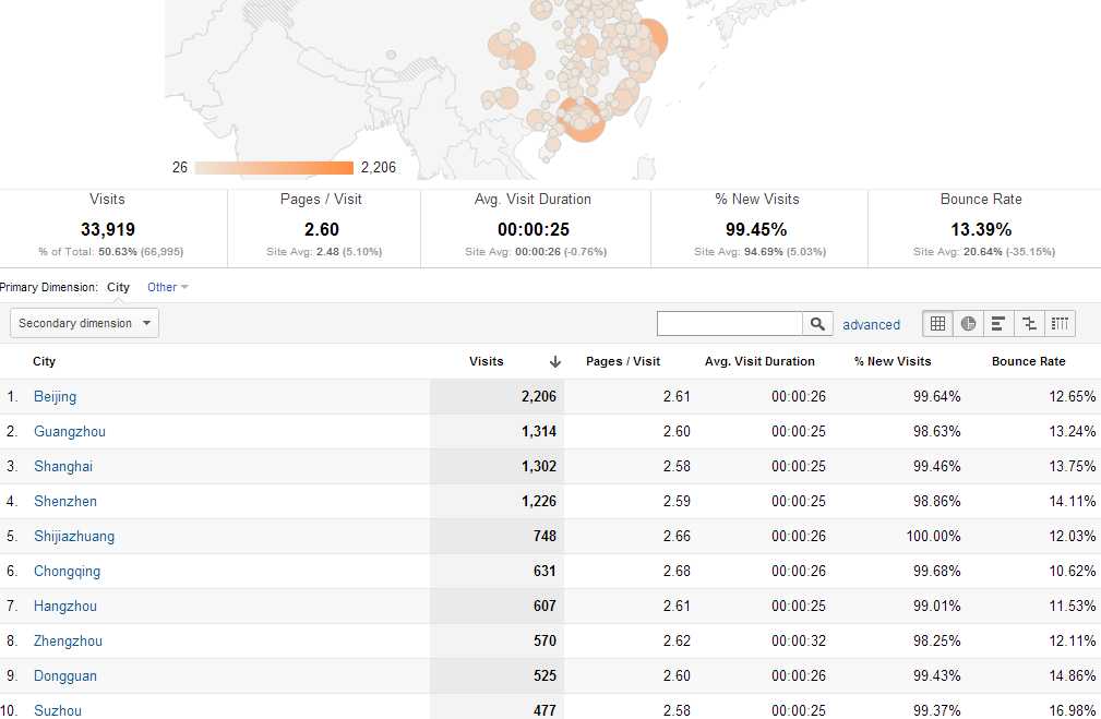 There are couple more thing that bother me: 1. All the countries have 2.6 pages (which is weird) 2. Very similar visit duration time 3. 99+% of new visits. 4. Even within Chinese cities, the numbers don't differ much. I've never had numbers that close even between cities (not talking about regions)