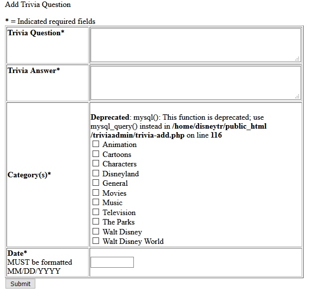 Guess it is worth a shot.... here is the code for that control page to add a new trivia question every day.... FYI the Depreciated Error comes up in the category section (see screen shot) <?php include("globals.php"); include("functions.php"); ?> <html> <head> <title>Add Trivia Question</title> </head> <link rel="stylesheet" href="<?php echo $siteURL; ?>styles.css"> <body> <span class="titlefont">Add Trivia Question</span> <p> <?php $question=$_GET["question"]; $answer=$_GET["answer"]; $category=$_GET["category"]; $sendDate=$_GET["sendDate"]; $submit=$_GET["submit"]; echo($category); if($submit){ // if they submit the form, run this stripslashes($question); // error checking sendDateCheck($sendDate); if(!$question){ $error = "true"; $questionERROR = "<span class=errorfont>This field is required</span><br>"; echo "question"; } else { $questionERROR = ""; } if(!$answer){ $error = "true"; $answerERROR = "<span class=errorfont>This field is required</span><br>"; echo "answer"; } else { $answerERROR = ""; } if(!$category){ $error = "true"; $categoryERROR = "<span class=errorfont>This field is required</span><br>"; echo "cat"; } else { $categoryERROR = ""; } // end error checking if(!$error){ // if there are no errors add the trivia to the database $sendDate = strtotime($sendDate); // check to see if date is already in DB $dateResult = mysql("$db", "select * from trivia WHERE sendDate = '$sendDate'"); echo mysql_error(); $num_rows_date = mysql_numrows($dateResult); if($num_rows_date > "0"){ // if the current date matches one in DB run this echo "Date already exists in database<br>"; $trivID = mysql_result($dateResult,0,'trivID'); echo "<a href=\"",$siteURL,"search.php?trivID=$trivID&gotResults=true\" target=\"new\">Click here</a> to see the current question for this date."; $sendDate = date('m/d/Y',$sendDate); } else { // if the current date does not match one in DB then add it $sql = "INSERT INTO trivia (question,answer,sendDate) VALUES ('$question','$answer','$sendDate')"; $result = mysql_query($sql); if(mysql_error()){ // if there is a mysql error show it echo mysql_error(); }else{ echo "Trivia added to database...<br>"; } // end if mysql error // get trivID of the one we just put in of triv_cat relational DB $result = mysql("$db", "select * from trivia WHERE question='$question' AND answer='$answer'"); echo mysql_error(); $trivia = mysql_fetch_array($result); // associate the trivID to the selected catID's in the triv_cat relational DB $num_rows=count($category); for($i = 0; $i < $num_rows; ++$i){ $catID = $category[$i]; $sql = "INSERT INTO triv_cat (trivID,catID) VALUES ('$trivia[trivID]','$catID')"; $result = mysql_query($sql); if(mysql_error()){ // if there is a mysql error show it echo mysql_error(); }else{ echo "Category / Trivia association added to database...<br>"; } // end if mysql error } echo "Fill out the form below to add another<p>"; // clear variables $question = ""; $answer = ""; $category = ""; $sendDate = ""; } // end if no date match } // end if no errors } // end if submit ?> <form action="<?php echo $PHP_SELF; ?>" method="get" name="memberAdd"> <?php if($error) echo "<span class=errorfont>There are errors. Please correct the marked fields, below.</span><br>"; ?> * = Indicated required fields <table width="600" border="1"> <tr> <td width="250" class="mainfont" valign="top"><b>Trivia Question</b>*<br><?php echo $questionERROR; ?></td> <td width="350"><textarea cols="50" rows="3" name="question" class="mainfont"><?php echo htmlspecialchars($question); ?></textarea></td> </tr> <tr> <td class="mainfont" valign="top"><b>Trivia Answer</b>*<br><?php echo $answerERROR; ?></td> <td width="350"><textarea cols="50" rows="3" name="answer" class="mainfont"><?php echo htmlspecialchars($answer); ?></textarea></td> </tr> <tr> <td class="mainfont"><b>Category(s)</b>*<br><?php echo $categoryERROR; ?></td> <td width="350"> <?php // get available category list $catResult = mysql("$db", "select * from category ORDER BY name"); echo mysql_error(); $num_rows_cat = mysql_numrows($catResult); $row = 0; while ($row < $num_rows_cat): /* used to loop through all records */ ?> <input type="checkbox" name="category[]" value="<?php echo mysql_result($catResult,$row,'catID'); ?>"<?php catChecked($category,mysql_result($catResult,$row,'catID'),$num_rows_cat);?>> <?php echo mysql_result($catResult,$row,'name'); ?><br> <?php $row++; endwhile; ?> </td> </tr> <tr> <td class="mainfont"><b>Date</b>*<br><?php echo $answerERROR; ?> <span class="minifont">MUST be formatted MM/DD/YYYY</span></td> <td width="350"><input type="text" name="sendDate" value="<?php echo $sendDate; ?>" maxlength="10" size="10"></td> </tr> </table> <input type="submit" name="submit" value="Submit"> </form> </body> </html> Code (markup):