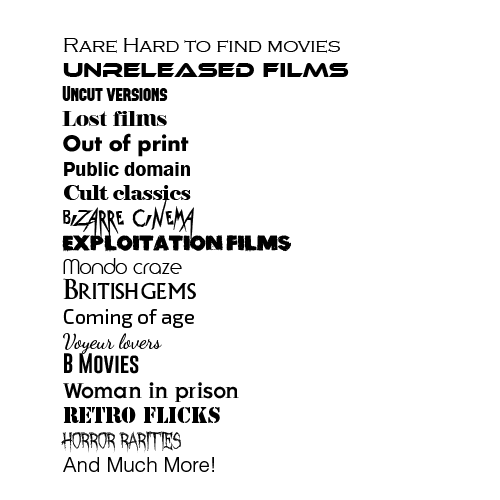 Hi I need a graphic with the following 18 keywords in different fonts. something like the sample but not in boxes and white background and doesn't have to be uniformed Rare Hard to find movies Unreleased films Uncut versions Lost films Out of print Public domain Cult classics Bizarre cinema Exploitation films Mondo craze British gems Coming of age Voyeur lovers B Movies Woman in prison Retro Flicks Horror Rarities And Much More! I like these type of fonts http://preview.tinyurl.com/kzmnpfy http://preview.tinyurl.com/movn83d http://preview.tinyurl.com/m5tr8u3 Thanks