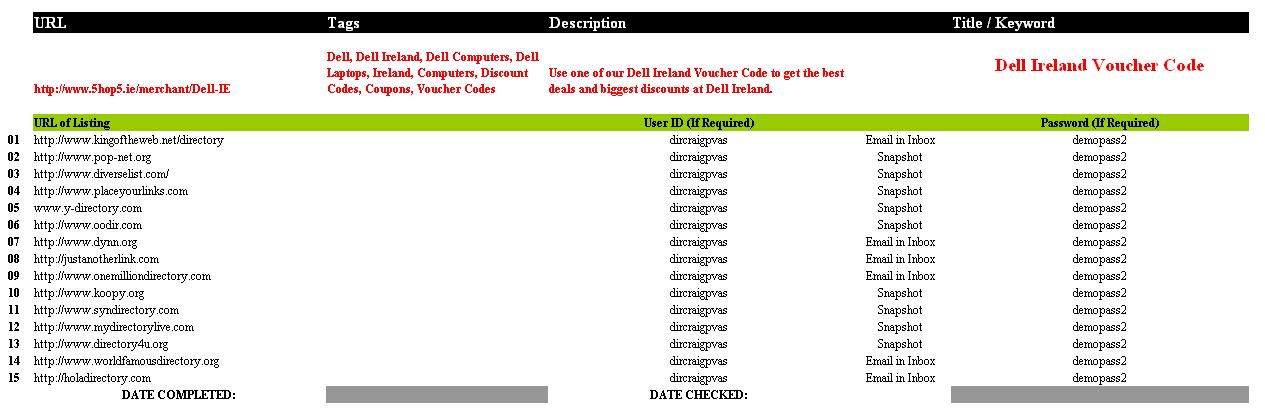 Directory submission is one of the useful ways to gain best, relevant one way links for your site. This process is now treated as a powerful web promotion by the online marketing companies and seo professionals as it helps at the same time to get important back links to your site and increase the traffic and your position in search engine. We submit manually to the directories with high page rank. We ensure you that your site is not enlisted previously. We handle the manual submission procedure with care and keeping in mind the web directory strategy. Advantage of manual Directory Submission Service: Manual Directory submission is an important way to increase the internet traffic of a site. It is a source that can make your site to get a better page ranking and to put your site to the highest web directories on the internet. If you are enlisted in a directory submission service, then you are creating an equipped link network to make huge web traffic to your site. As a good traffic can provide your site popularity and profit, so it’s important to get the manual directory submission service that assist you to have the high search engine ranking. This service will not only boost your site’s link popularity but also add more trust factor for search engine positioning. Why to prefer me? We possess professionals in our team who will serve you in manual directory submission by building links through directory submission. It’s a time consuming work to submit manually. We provide the best option to get enlisted in search engine directories at a reasonable price. Our motto is to place your website to the most useful seo friendly directories. We offer you the list of directories with different link anchor text relevant to your website. We boost keyword- augment headings and page details for your lists. We submit manually in the relevant categories that are best for your website. Not necessarily every directory gets approved by us. We only correct high quality related directories for your site in which it will get listed. Benefits of Manual Directory Submission Service: [*]Provided service will be done manually by efficient employees only. [*]Links that are offered are inbound and one way. [*]The service is cost-effective. [*]Always providing advanced submission report. [*]Various anchor text and tags. [*]Necessary deep links are put into operation. Our Directory Submission Service Report Format If any one is Interested PM me..