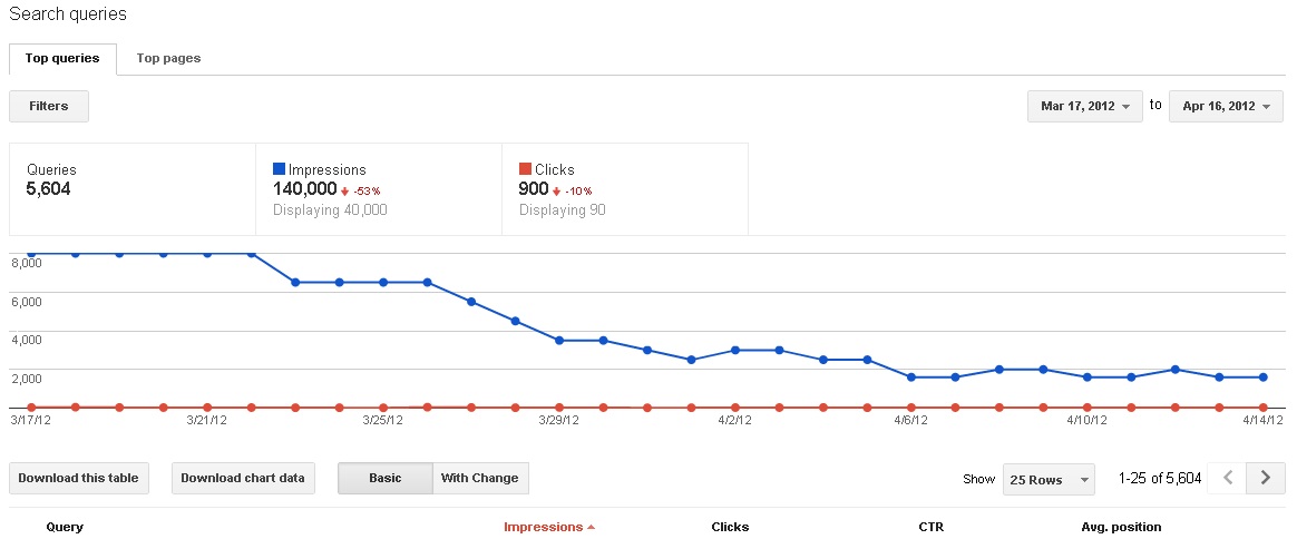 big changes in the last month... i must admit i have been falling behind in what's 'new' and current with google , but this graph of the last months impressions will give you some idea of how recent changes affect me .. What's even more alarming ? this site im talking about today is ranking higher on words i havn't optimised for .... in fact , its ranking for words and phrases that actualy have little to do with my site.. while words and phrases that actually match my sites content are falling in position sometimes falling further than page 10 ! i really hope this problem is realised soon by google techs.