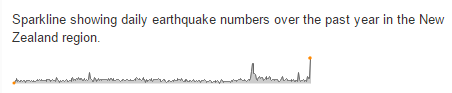 Normally I'd be all "Oh that was at the other end of the country" and the bloody thing was yet it still woke me up at midnight, had the windows rattling and the pool sloshing water around like it wanted to create it's own little tsunami. Literally took 5 minutes for the sound of the sloshing to die down. Some of the quakes were quite close (we didn't feel any others, phew) - too many overnight for the close ones to even show on the map so some people will have had a long and sleepless night. 2 families are mourning loved ones and there are reports of damage to property, roads etc. We had tsunami reports, it was all on in some parts of the country, and sadly the scum of the world were up and taking advantage of people fleeing their homes. This graph is so teeny but if you look really closely you can see that the count has gone through the roof. Interesting that the last few months seem to have been busier - the public have been oblivious but I bet the scientists have been all over it.