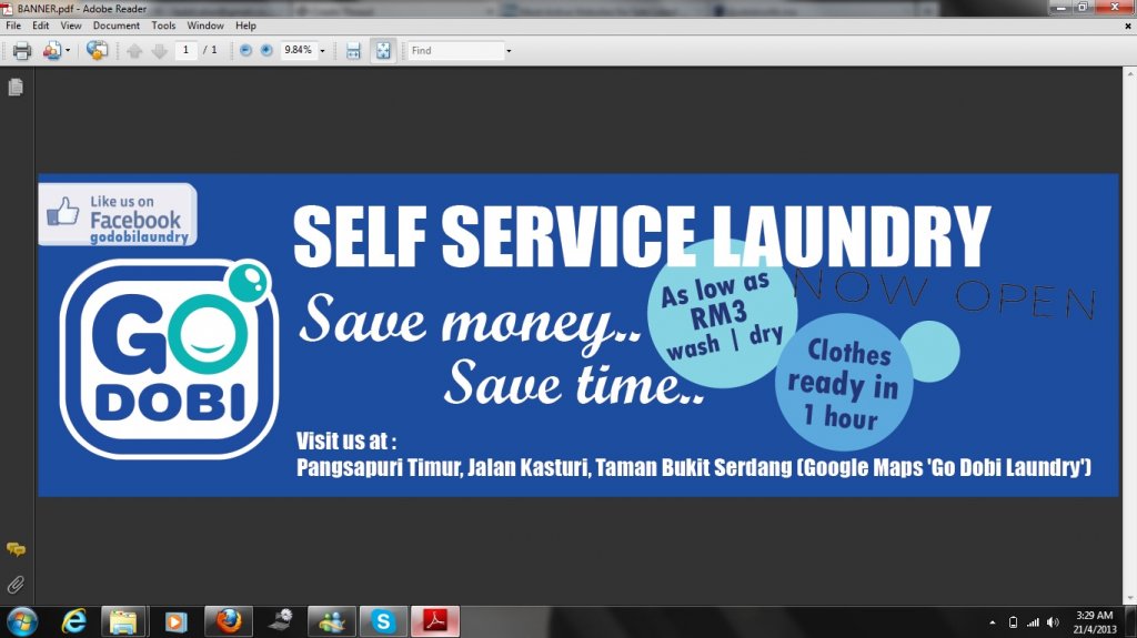 Hi there, As state on the title, i need someone to re-design me my laundry shop banner, detail as below (Also Refer file attach): Text On it: Change Self Service Laundry to Dobi Layan Diri Save Money.. Save Time.. As low as RM3 per wash/dry Clothes ready in 1 hour Visit us at: No 17, Jalan Opera F U2/F, Taman TTDI Jaya (Opposite 99 Speedmart) Put the facebook like same like the old banner.... Banner Size: 10ft x 3ft Logo: http://godobiwithme.tumblr.com/ Banner Reference: Check the file attach Format: ai, psd and PDF Winner of this contest will get $15 payment via Paypal