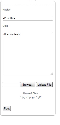 I'm creating a funny images site and I need to make it possible for users to upload their own images easily. Right now I've found few plugins but none does exactly what I need. Basically I need combination of Quick Post Widget and Upload Widget You can see site here: http://www.xtremevideos.info/ So what I need is to put file upload into quick post so final would look like this : Also after pic is uploaded it should automatically get inserted into the post.