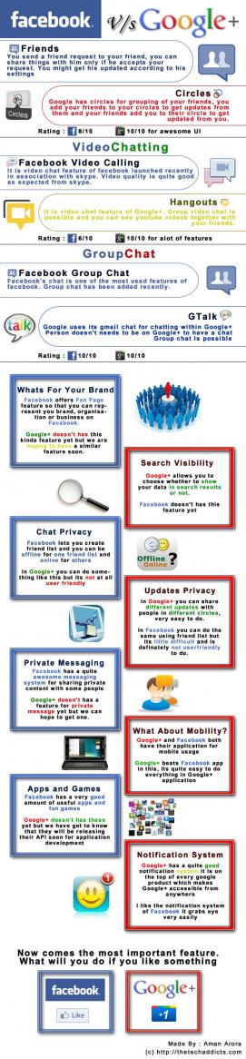 Comparing Facebook and the Google's much buzzed Google + is pretty difficult to do. There were comparisons all over the web, showing how Google's new social network is better than Facebook and how it's not. The guys @ The Tech Addicts has done it well, so let's get onto the infographic and compare the two big players. In my view, Google + is still very young to compete in a full pace with Facebook, the actual tales will reveal only when it is available for the mass. facebook versus google plus Facebook Vs Google Plus [Infographic] The infographic takes up certain criteria and weigh both the social networks for its pros and cons. Take a look at it for yourself. Find more @ Webscut : http://www.webscut.blogspot.com