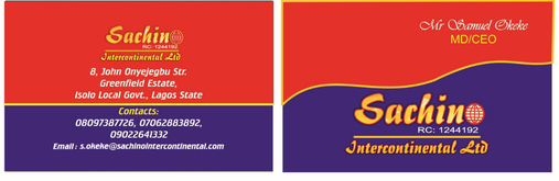 I need a fast logo design and 4 other items. The name of logo is Sachino Intercontinental Ltd. They sell food items, cosmetics, business consulting, etc. With this logo, you will create a busines card, letterhead, invoice and leaflet for my client. Please find attached sample of the leaflet and business card. On the leaflet, these are the information that needs to be entered below: Sachino Fish rather than Sachino food storage condition - keep in a cool dry place 250g Ingredients: salt and catfish Address: 21 road, R close, house 8, Festac town, lagos state, Nigeria. NAFDAC REG NO...................... BN................... MFD................. BBD.................. Please do not use image of fish on leaflet. Use the address on the business card for the business card, letter head and invoice design only. The best design gets $50 via Paypal.