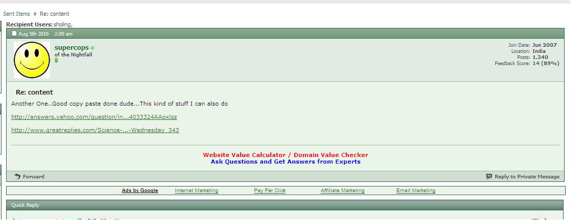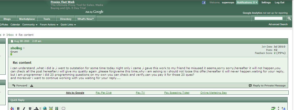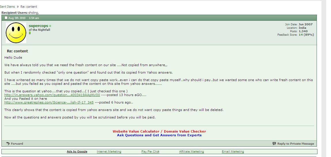 Hello Sholing I do not know much about what you did with supercops. But dude you really are a cheater and you do not deserve to work for anyone. People, I do not want to disclose my site here but this guy (( Sholing )) is a real cheater. He will make a mess of your article / forum post. Look at his English...and decide .Is he eligible to write fresh content on your site ?? Do you want your users to read this kind of english.... I guess after reading this thread more people will be reviewing Sholing 's "Services" which are just a bullshit. From my side all I can say is I am totally dis-satisfied.