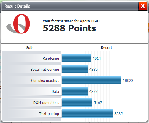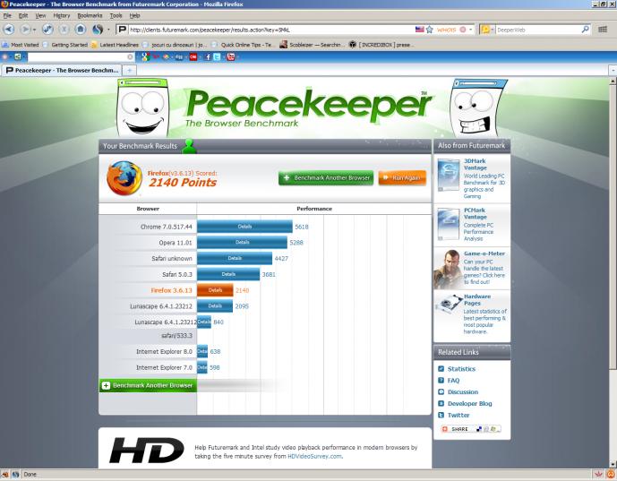 Since every time I see this topic started on a forum, the entire thread ends up in a fight without a purpose between fans of various Web browsers, this morning I decided to do a little test just for myself. After running the entire benchmark at least two or three times for each browser, I ended up with some interesting results, so I decided to come here and share the results with the rest of the community. First of all, let me tell you a few words about the hardware/software setup used: AMD X2 4000+ Brisbane CPU@2.5 GHz, 2 GB DDR2@840MHz and 4-4-4-11 CR2 latency, MSI NEO-F v3 mainboard, 1 TB 7200 rpm drive with 32 MB buffer, HD 4770 video with 512 MB GDDR5 memory (I guess the HDD and video card don't matter much) running Windows XP SP3 Professional. At the time of the tests, I had Xion Player running, Pidgin and the antivirus - Avira AntiVir Personal. For every browser, I ran the tests with a single window/tab open. The browsers used are these: Opera 11.01, Firefox 3.6.13, Chrome 7, LunaScape 6, IE 7/8, Safari 5 and, finally, Maxthon 3. I see no point in messing with others like Avant, GreenBrowser, Flock and so on, since they use the same rendering engine as IE or Chrome, so their speed improvements can only be marginal, IF you get lucky... ... but let's cut the chatter and let the numbers speak! Conclusions? Your turn! P.S. In case you are looking for someone to write decent software/hardware-related articles, I am available for work, so feel free to contact me! P.S. 2 Since I can't attach more than 5 images to this post, feel free to grab the full size images from here.